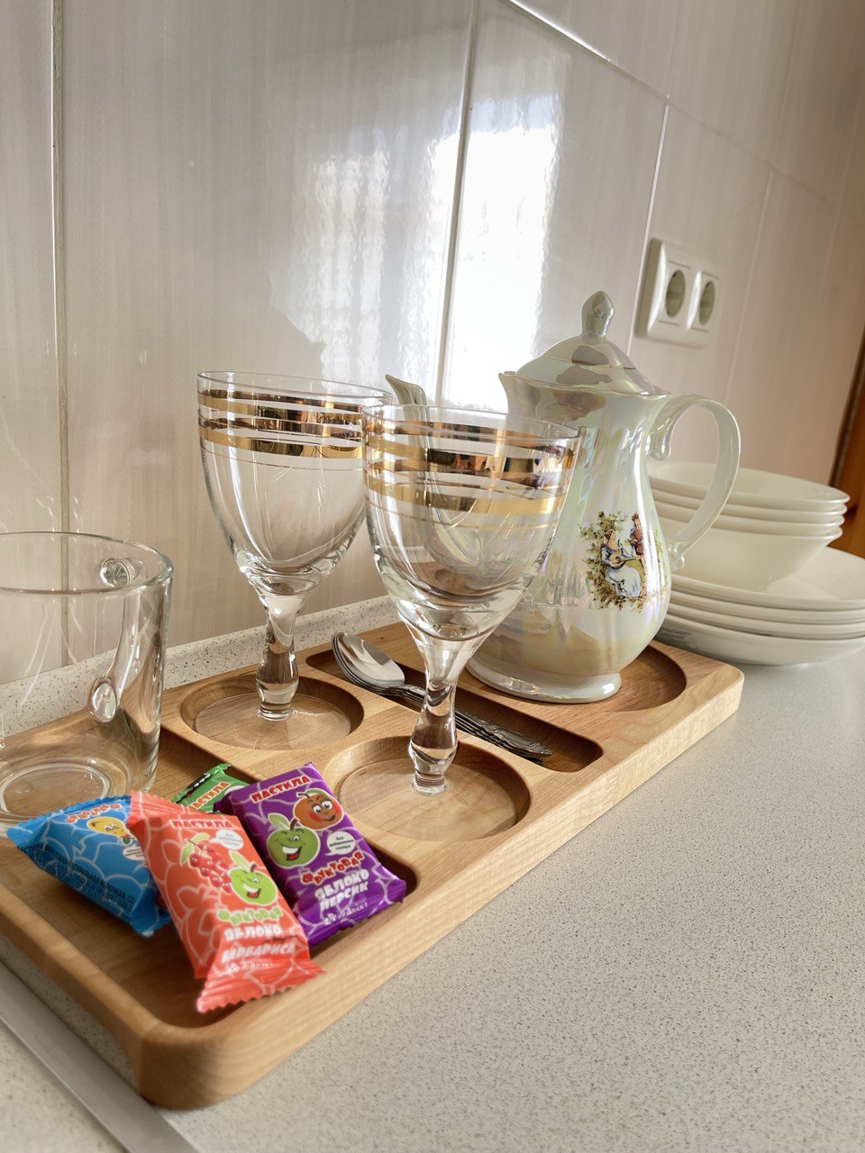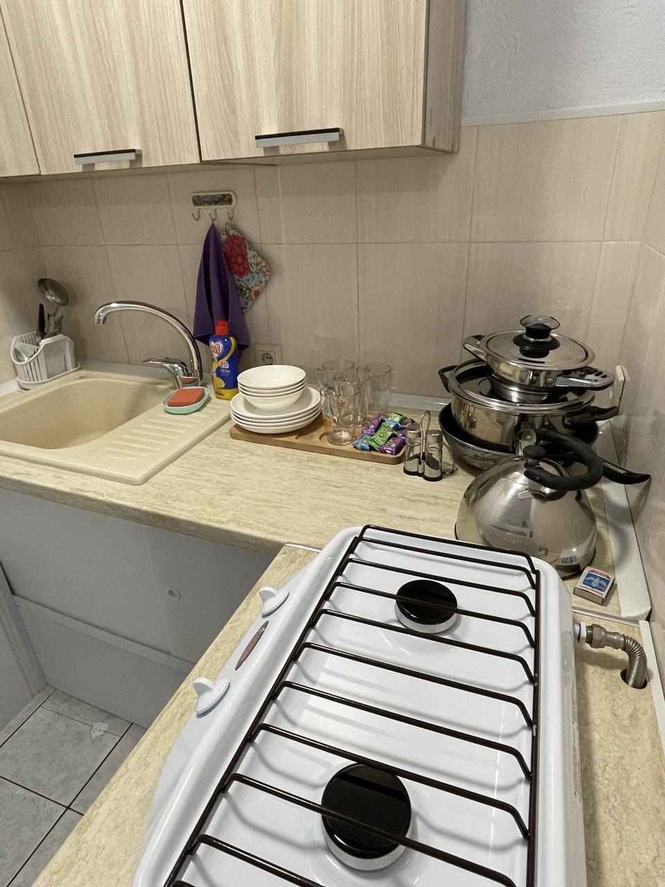 - Кухня с плитой для приготовления и всей необходимой посудой: кастрюля, сковородка, чайник, ложки, вилки, тарелки, бокалы и тд;