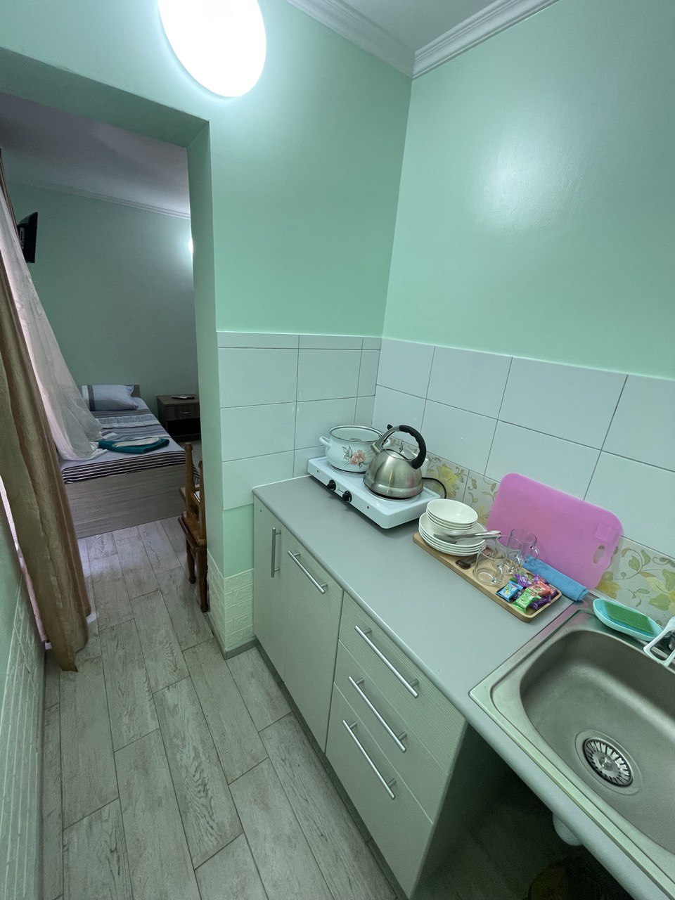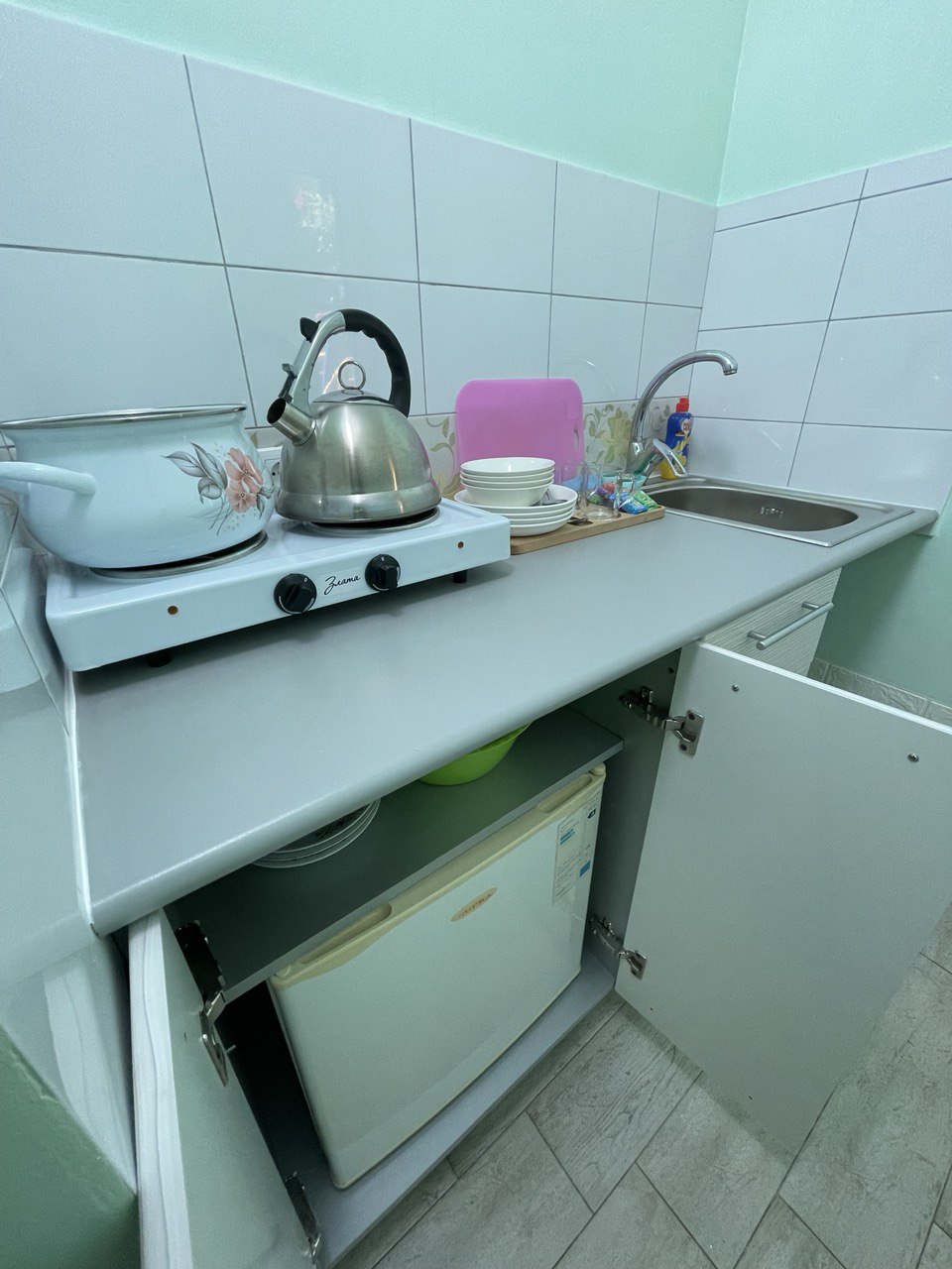 Студия с собственной кухней, оборудованной всем необходимым: плита, кухонный гарнитур, раковина, посуда.
