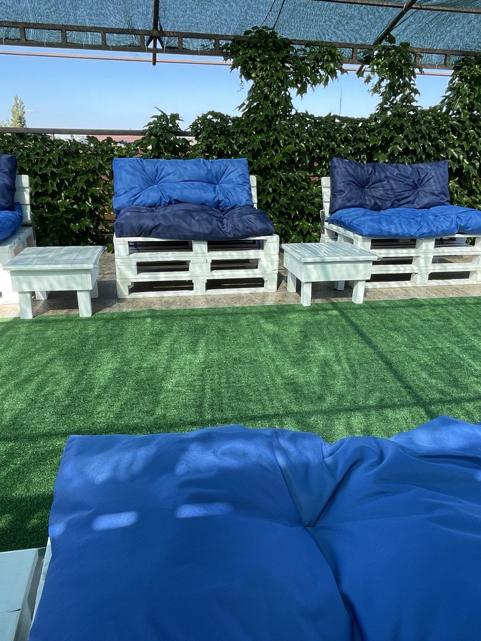 - На верхней террасе - лаунж зона с шезлонгами и зонтами.
